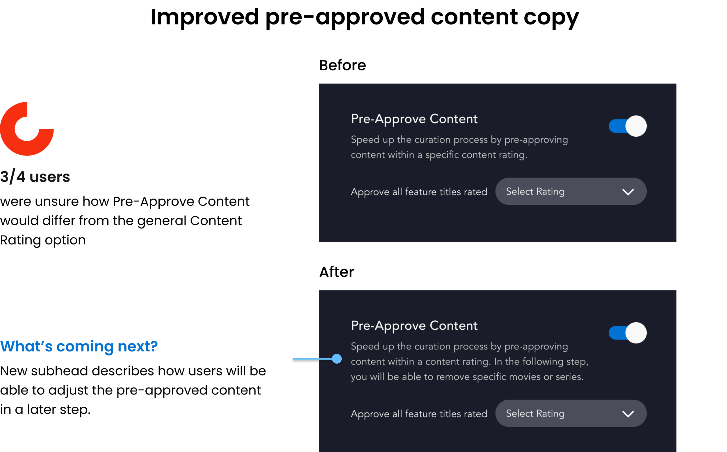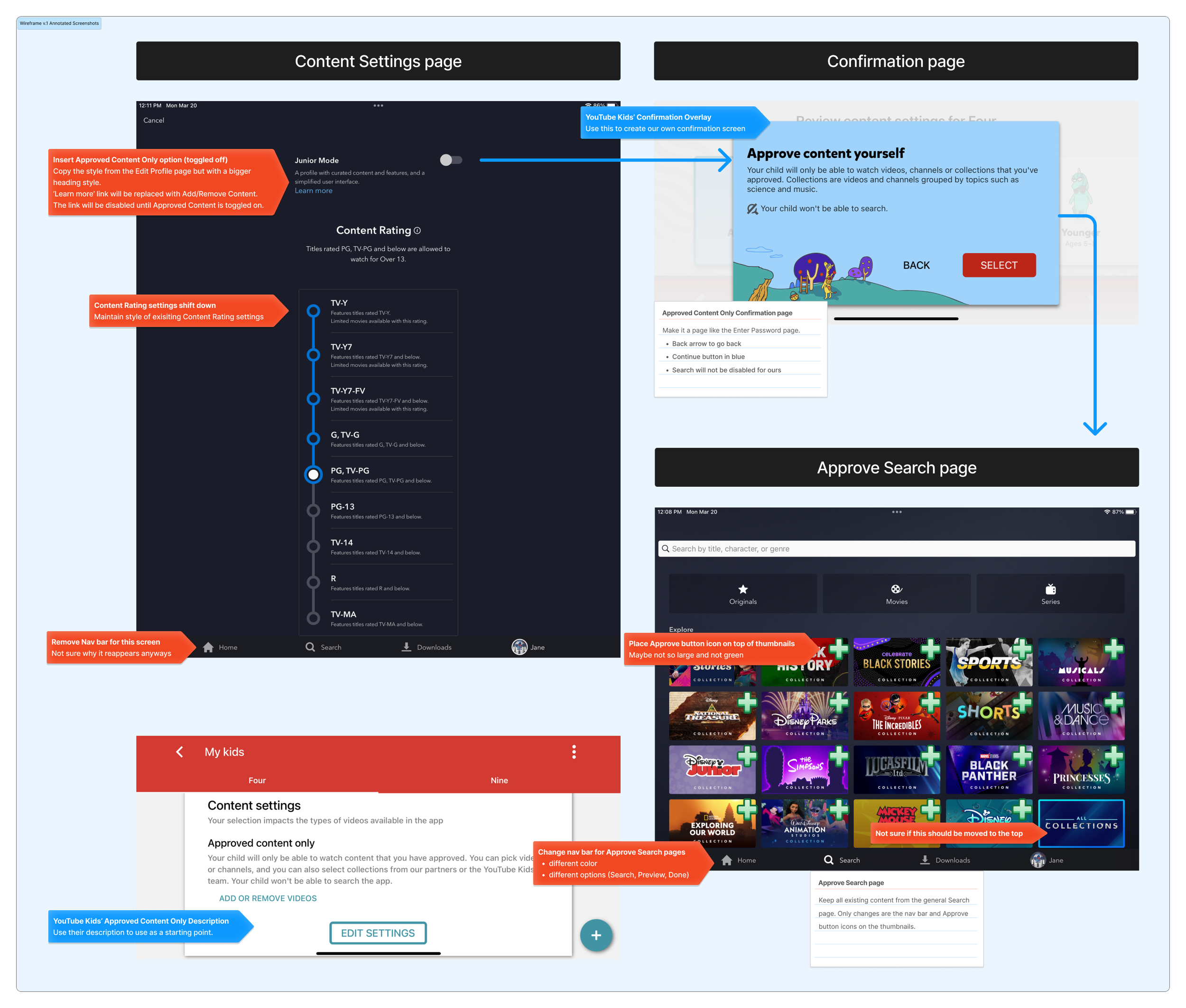 While giving parents ultimate control over all content on their children’s accounts is ideal, our user insights showed that parents are busy. So I added a preliminary screen to the Approve Content flow that allows parents to pre-approve content within a particular content rating to speed up the content approval process. Parents will still be able to adjust the selection by adding to or removing any content they pre-approved.