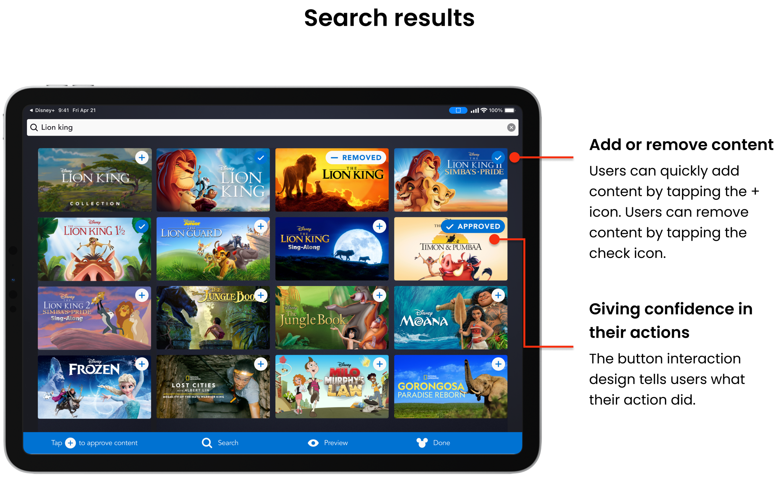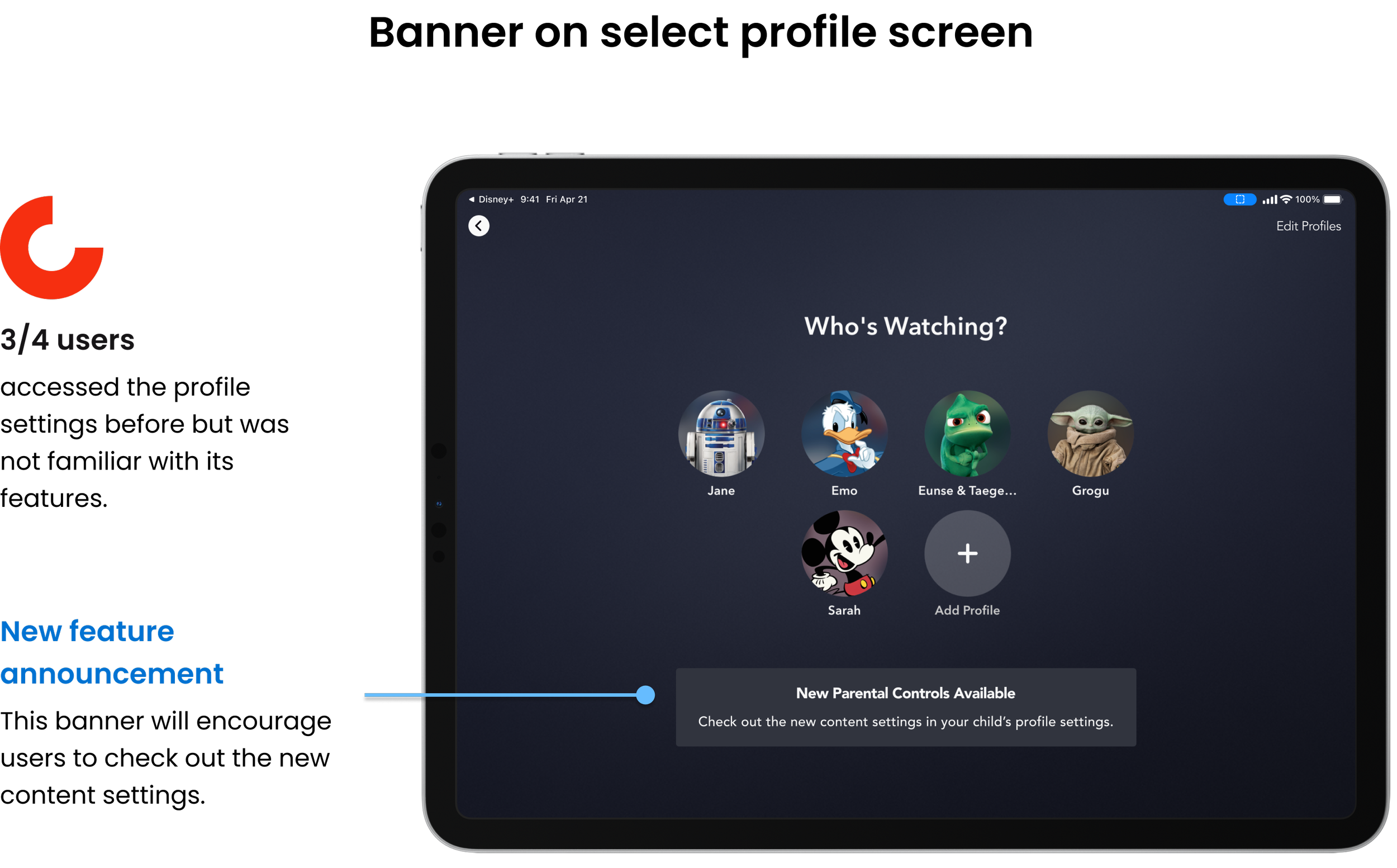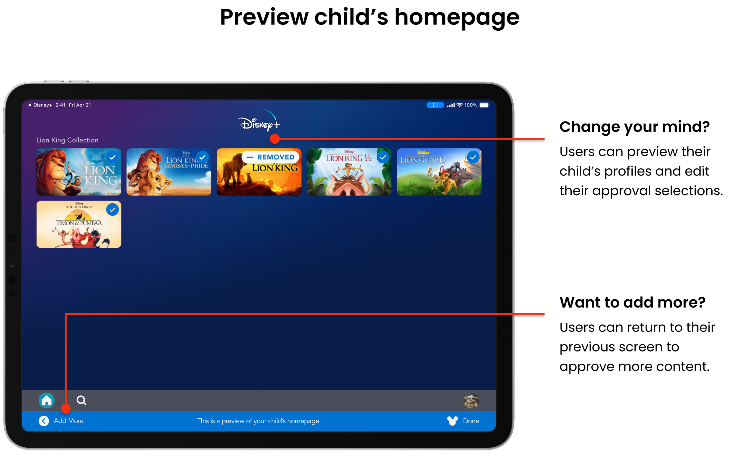 The solution: A feature that allows parents to curate specific titles, series, and/or collections for their child’s Disney+ profile to limit the content to those that have been approved by the parent.