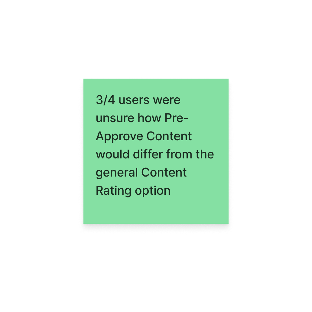 Overall the general flow and the Add/Remove iconography were easy for the users to follow. Most other hiccups in the usability testing occurred on an individual level. However, one thing that 3/4 users were not able to differentiate were Content Ratings and Pre-Approving Content. Also, 3/4 users stated that they were unfamiliar with the profile settings because they never revisited them after initially setting up the profiles.