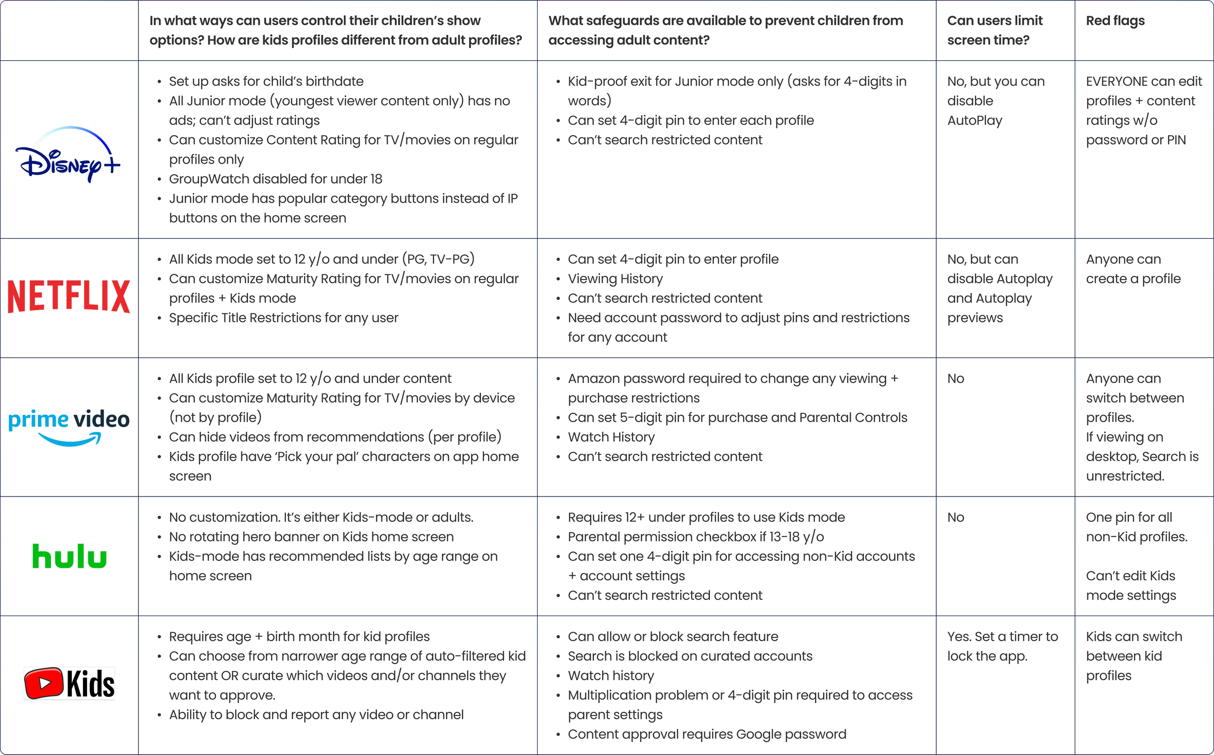 Competitive analysis comparing parental controls of 5 streaming services, including Disney+.