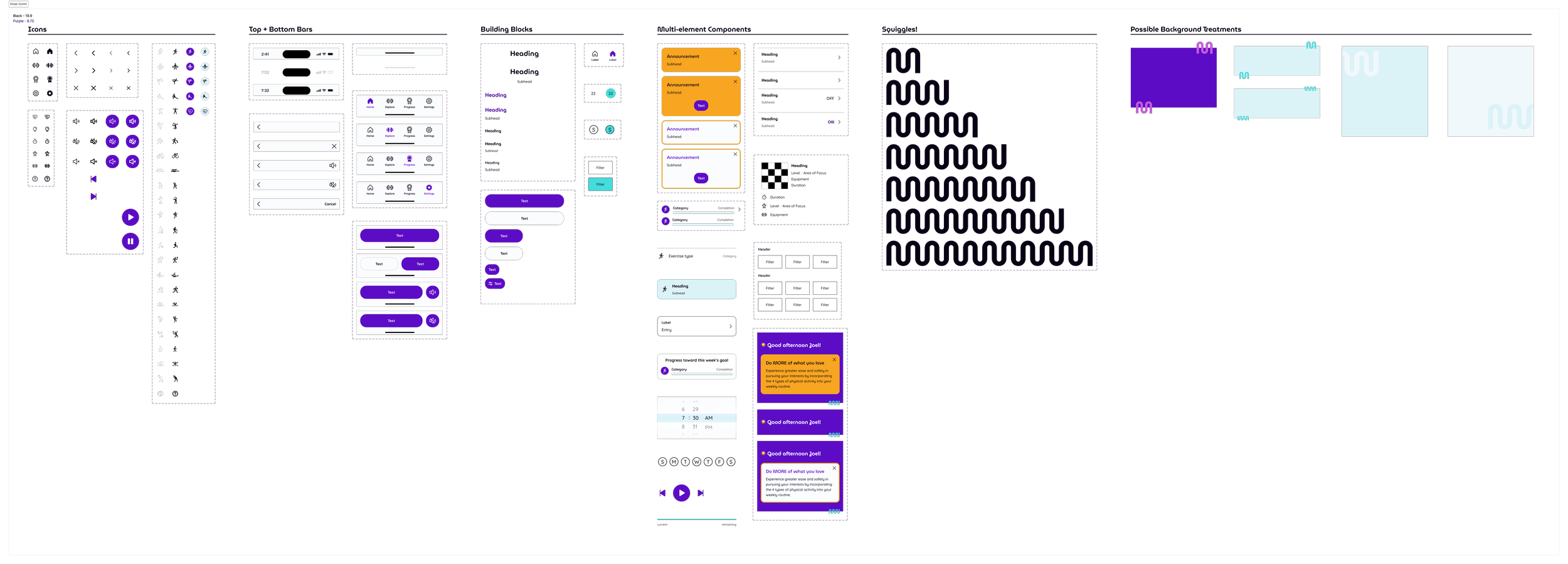 Design system showing icons, buttons, and components. View the design system/UI kit via Figma.