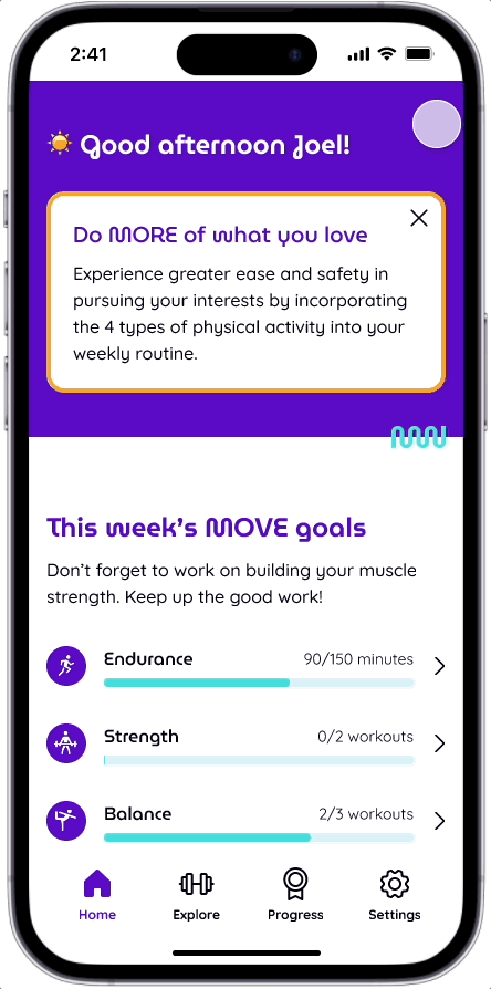 The solution: A fitness app designed for older adults that helps users increase mobility and decrease sedentary time by encouraging users to incorporate 4 exercise categories (endurance, strength, balance, and flexibility) into their weekly routines through reminders and goal tracking.