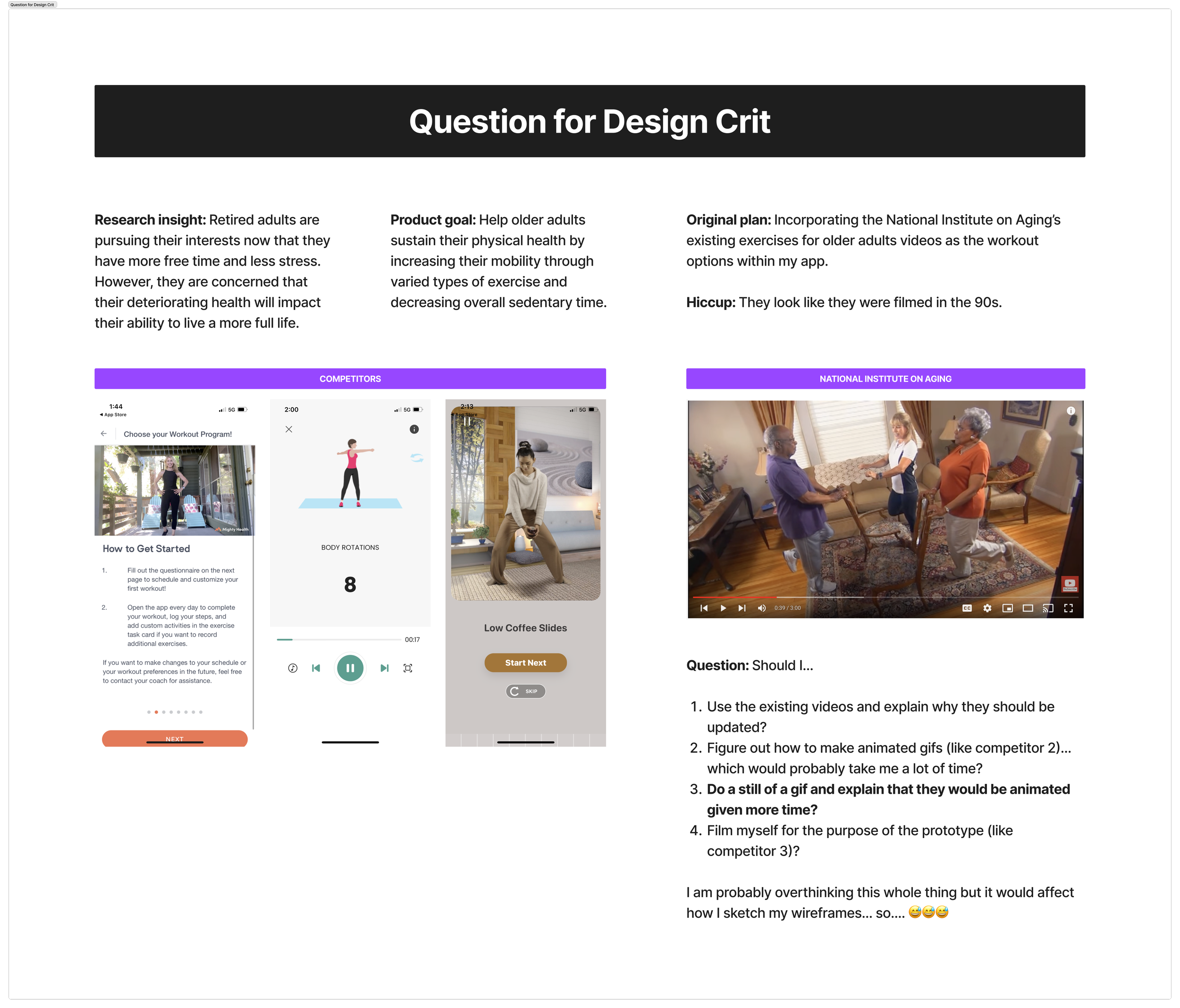 As I worked through the user flow for completing a workout within the app, I had trouble visualizing what the workouts would look like. Initially, I hoped to use the National Institute on Aging’s YouTube videos but they were severely outdated and filmed strangely.